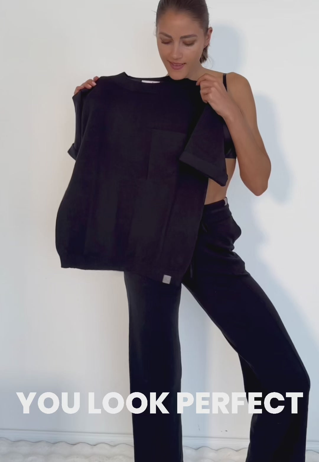 Wednesday, 1 pm. The morning has flown by, now it's time for lunch with Eveline and then a walk in the park with the dogs. I feel really comfortable in my skin today. The top is a real eye-catcher, a different kind of T-shirt but still casual. I don't have to constantly change my clothes either, because with my modern knitted top I'm always perfectly dressed for the office and leisure time. Easy going!