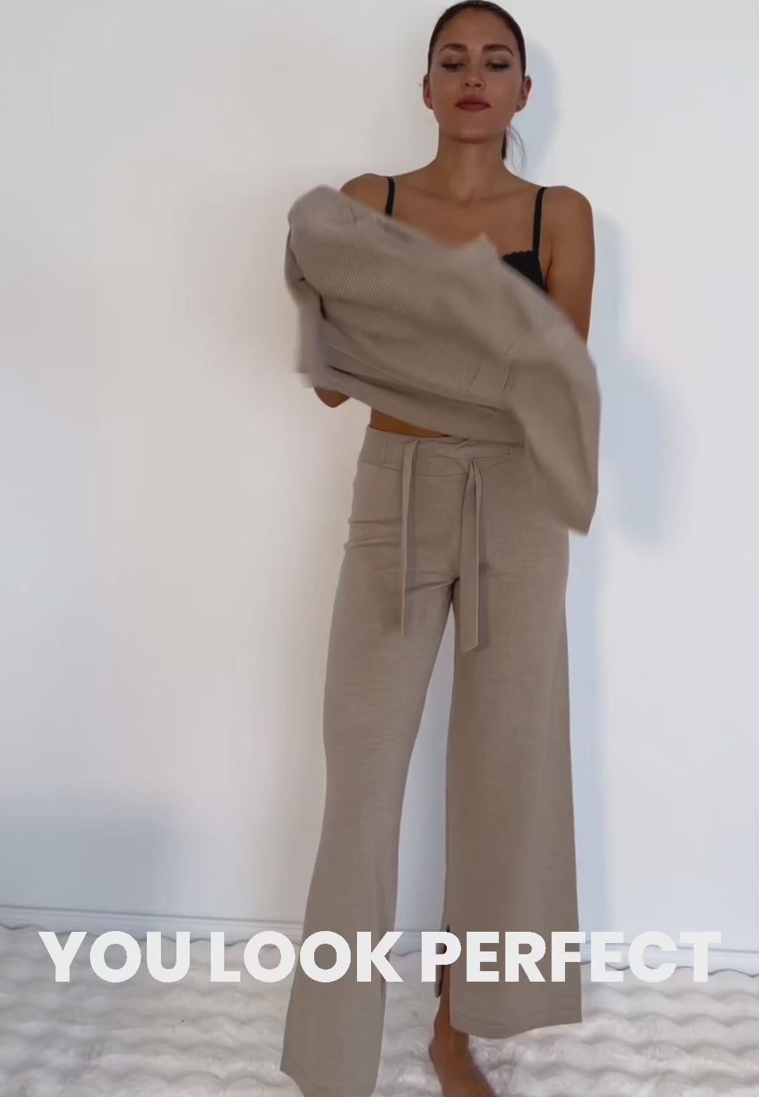 Cozy house suit for women, consisting of Daria pullover and Bailey pants. The half-sleeved sweater impresses with a beautiful ribbed shape in the front part and the small stand-up collar. Perfectly matching is the wide knit pants with a bow at the waist.