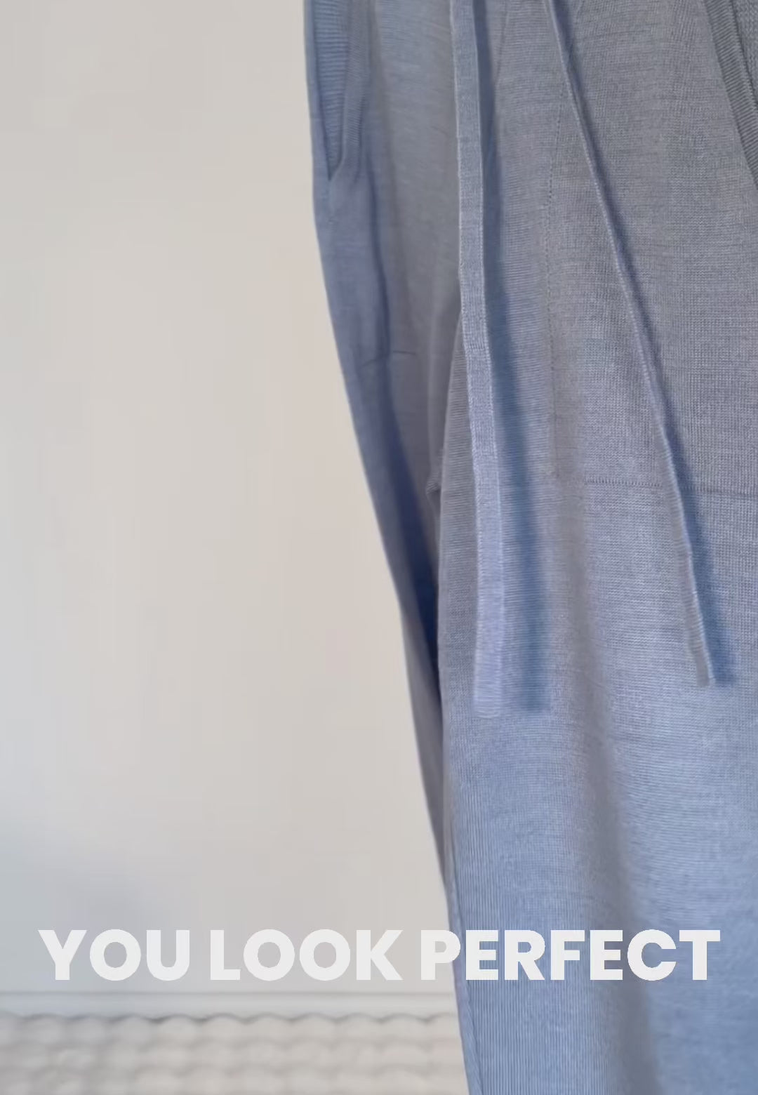 Elegant merino homewear set for women, consisting of the Blossom top and Bella pants. The ribbed knit top has a pretty edging on the edge and a round neckline in the front and back. The cozy relax pants have knit-in pockets with a classy knit insert behind them and have no side seams. The pants have a sporty touch with drawstring and hem cuffs.