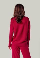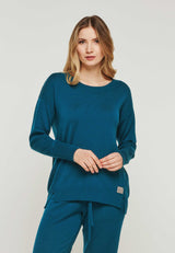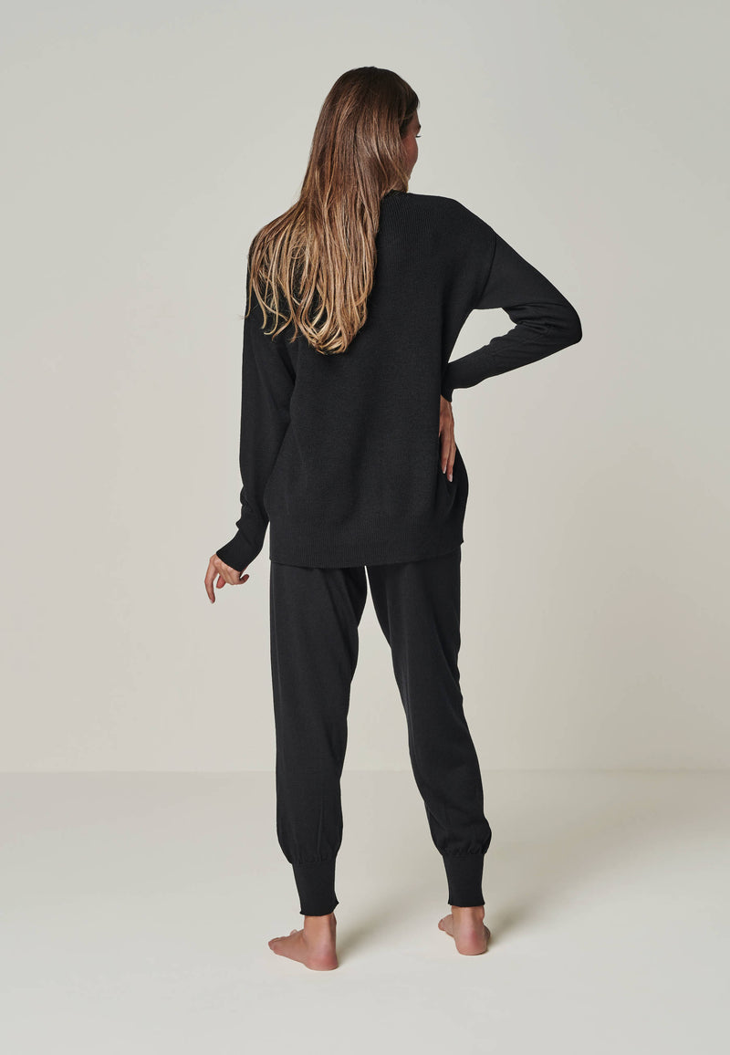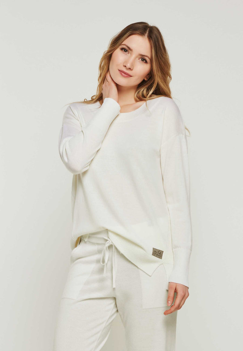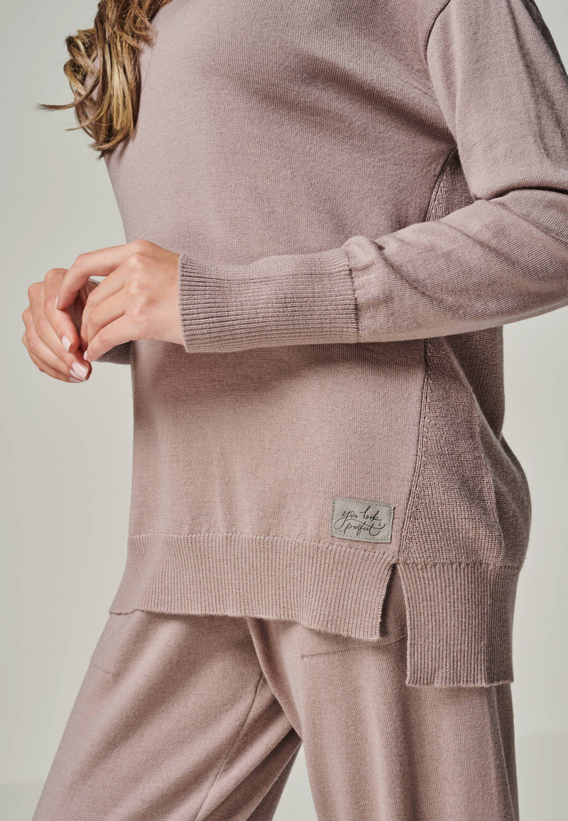Pullover Bella ist ein sehr schicker und edler Feinstrick Pullover mit einem gerippten Rundhalsausschnitt. Das Rückenteil ist im Perlfangstrick etwas dicker abgestrickt und verläuft in einer nach vorne gelegten Seitennaht. Dort hat es einen kleinen Schlitz am Saum. Er ist ein idealer Luxury Loungewear Begleiter, wunderbar zu Hause, in der Arbeit oder in der Freizeit zu tragen.