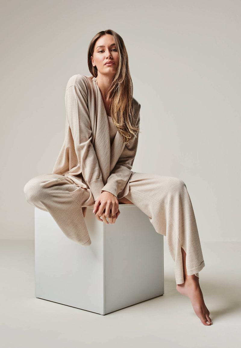 Cardigan Bella ist ein stylischer Strick-Cardigan für Damen mit einem ausgeklügelten Wasserfall-Ausschnitt, der sich an der Schulter durch Druckknöpfe leicht schließen lässt. Er ist der perfekte Loungewear Allrounder - sehr gemütlich zu tragen und chic im Alltag, aber auch perfekt auf Reisen oder zum Dinner.